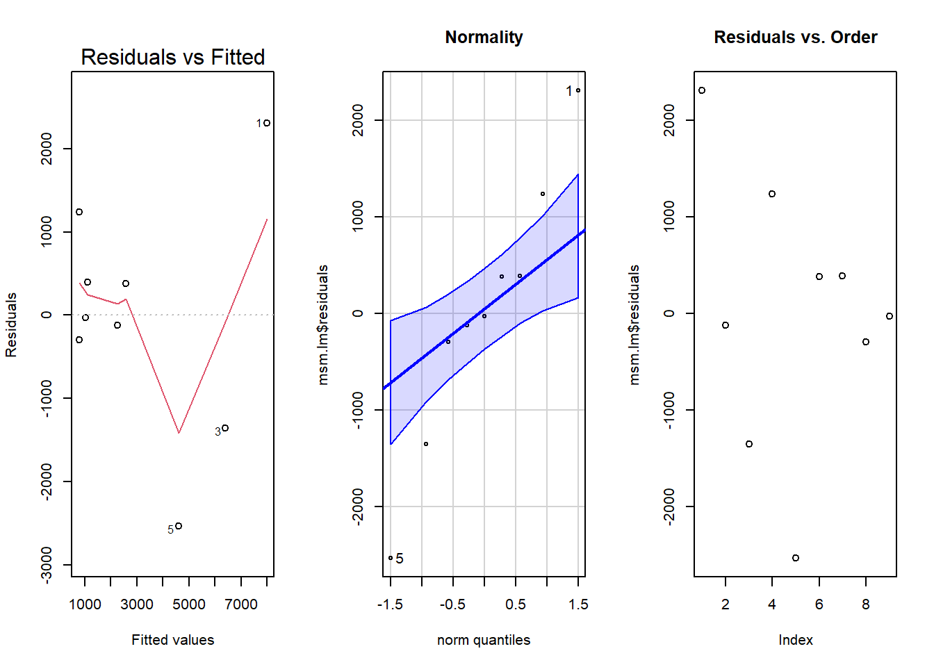 The three above graphs help me to see whether the linear model is appropriate and fits the data. There do seem to be a few outliers in the Residuals vs. Fitted plot, causing the red line to go down and making the data not quite linear. In the Normality plot, although most points are within the blue, making them normal, the outside points are making a slightly different shape from a straight line, which suggests that there may be a different pattern than the one tested for in this analysis. However, the Residuals vs. Order plot shows that the points are independent.