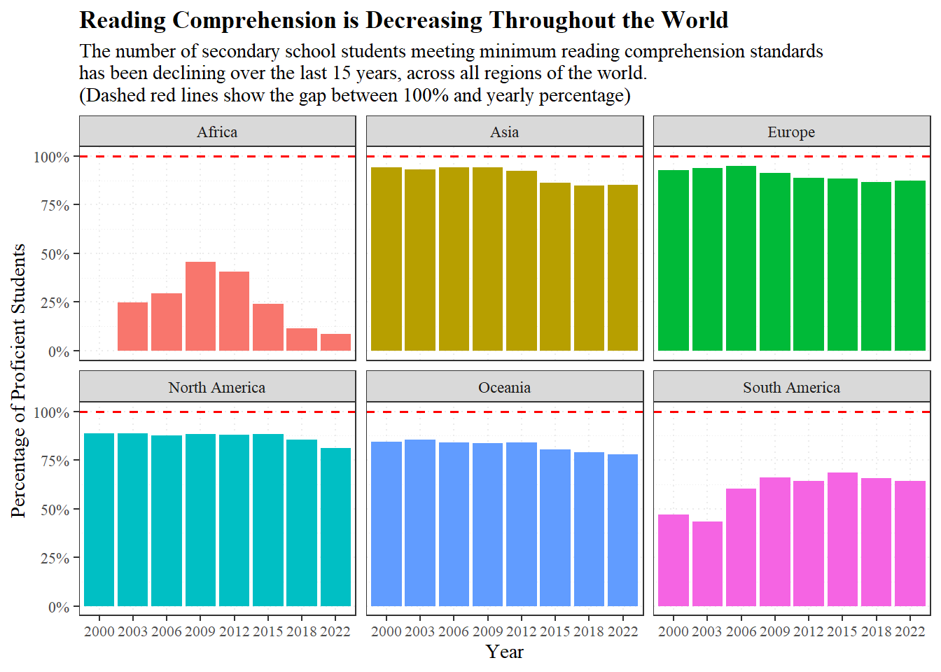 subtitle = "The number of secondary school students meeting minimum reading comprehension standards \nhas been declining over the last 15 years, across all regions of the world.\n(Dashed red lines show the gap between 100% and yearly percentage)",