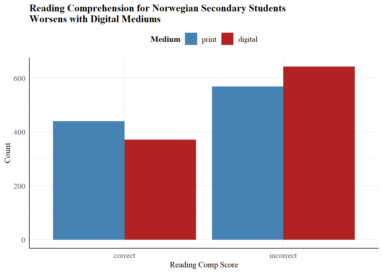 I propose that a potential reason for the decline in reading comprehension throughout the world, could be the rise of digital media. I will use data from a Norwegian study to test this using a chi-squared statistical test, which evaluates the relationship between categorical variables (in this case, reading comprehension score and medium).